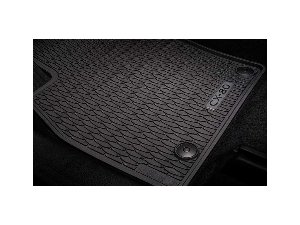 Sada čtyř rohoží s kovovým logem „CX-80“ na předních kobercích a originálním upevňovacím systémem Mazda (čtyři upevňovací kroužky, přední).