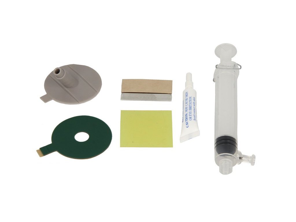 stříkačka s připínáčkem, silikonový hrot aplikátoru, pryskyřice, samolepicí těsnění, fólie fólie, žiletka