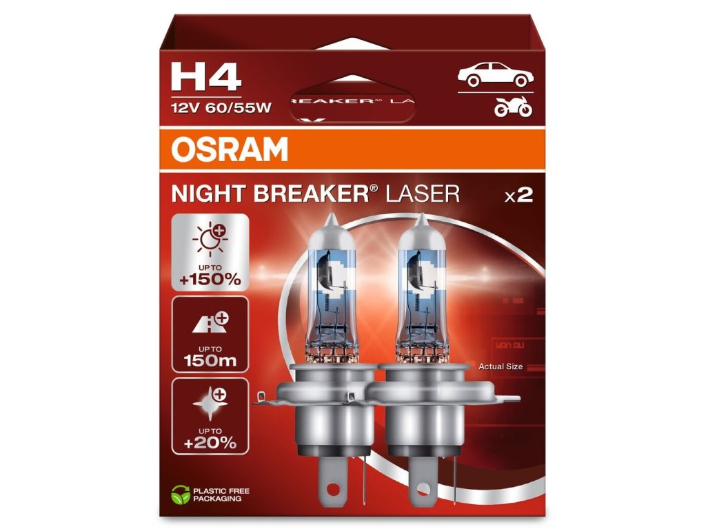 Žárovky Osram H4 Night Breaker Laser (Next Gen) definují nové standardy v oblasti halogenového osvětlení. Díky unikátní technologii laserového odstraňování povrstvení (ablace) nabízí tyto žárovky precizní světelný tok, který efektivně prosvítí tmu a zlepší reakční dobu řidiče.