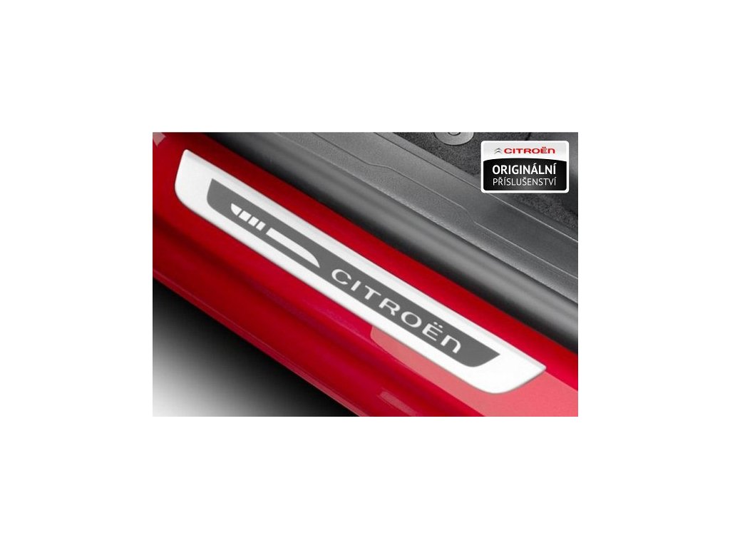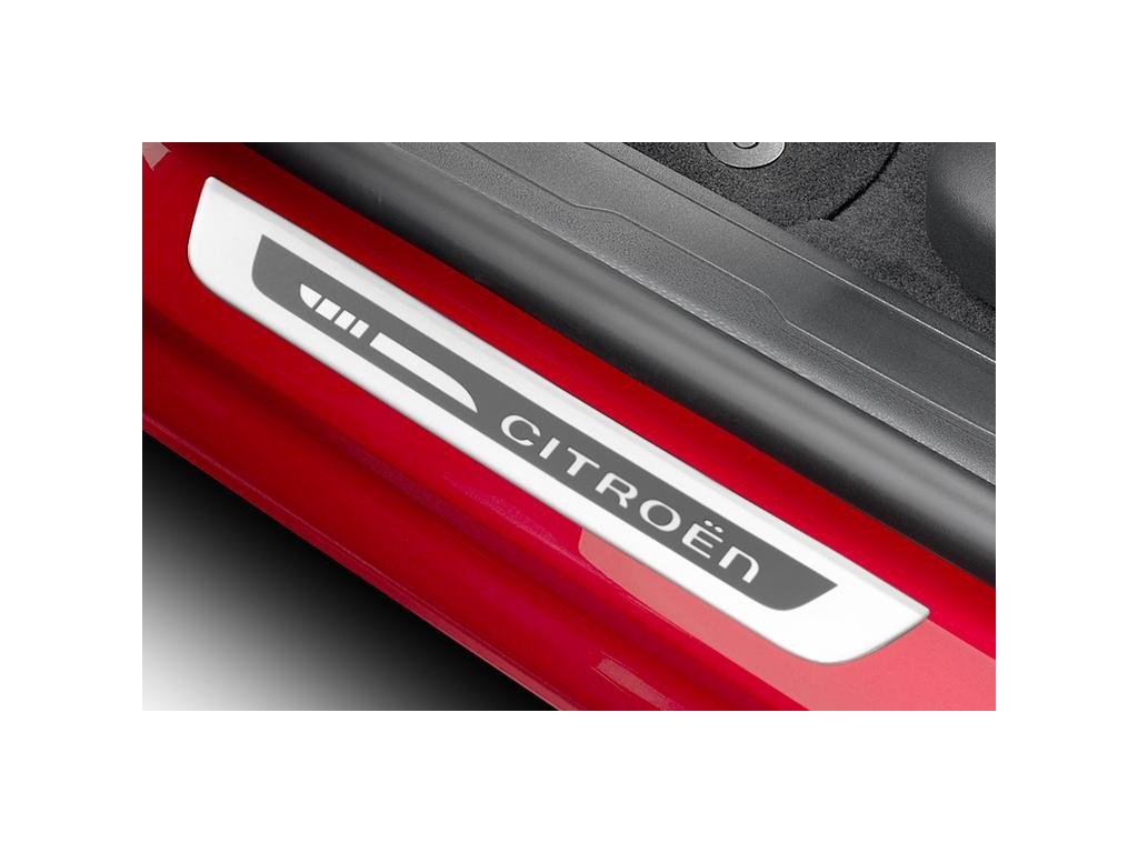 Sada dvou ozdobných krytů prahů předních dveří z polyuretanu s 3D efektem a označením "CITROËN", vzhled kartáčovaného hliníku. Účinně chrání karosérii vozidla proti poškrábání a potlučení.