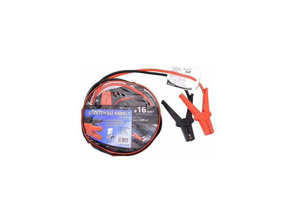 Startovací kabely s vodiči o průřezu 16 mm2, s plastovou izolací a délkou 3 m. Vhodné pro osobní auta s benzínovými a menšími naftovými motory. (do 2500cm3)