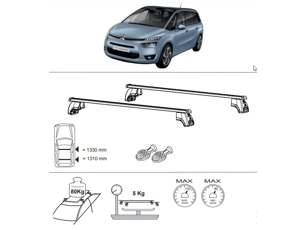 Sada dvou příčných střešních tyčí z oceli s potahem z PVC. Příčníky pro C4 Grand Picasso - Spacetourer od rv. 2013, které se montují na podélné střešní tyče (hagusy). Střešní nosič je vybaven systémem zabraňujícím krádeži, integrovaným v každé stojině.