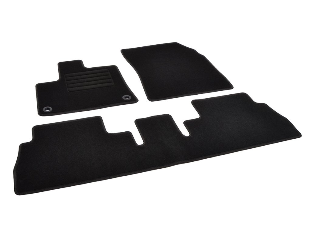 Sada přesných textilních autokoberců Standard, od českého výrobce, v černé barvě s černým přízovým obšitím, zesílením pod pedály a originální fixací.