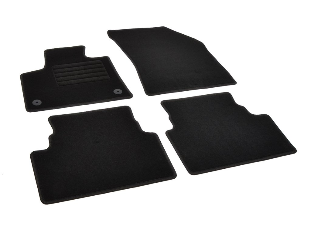 Sada přesných textilních autokoberců Standard, od českého výrobce, v černé barvě s černým přízovým obšitím, zesílením pod pedály a originální fixací.