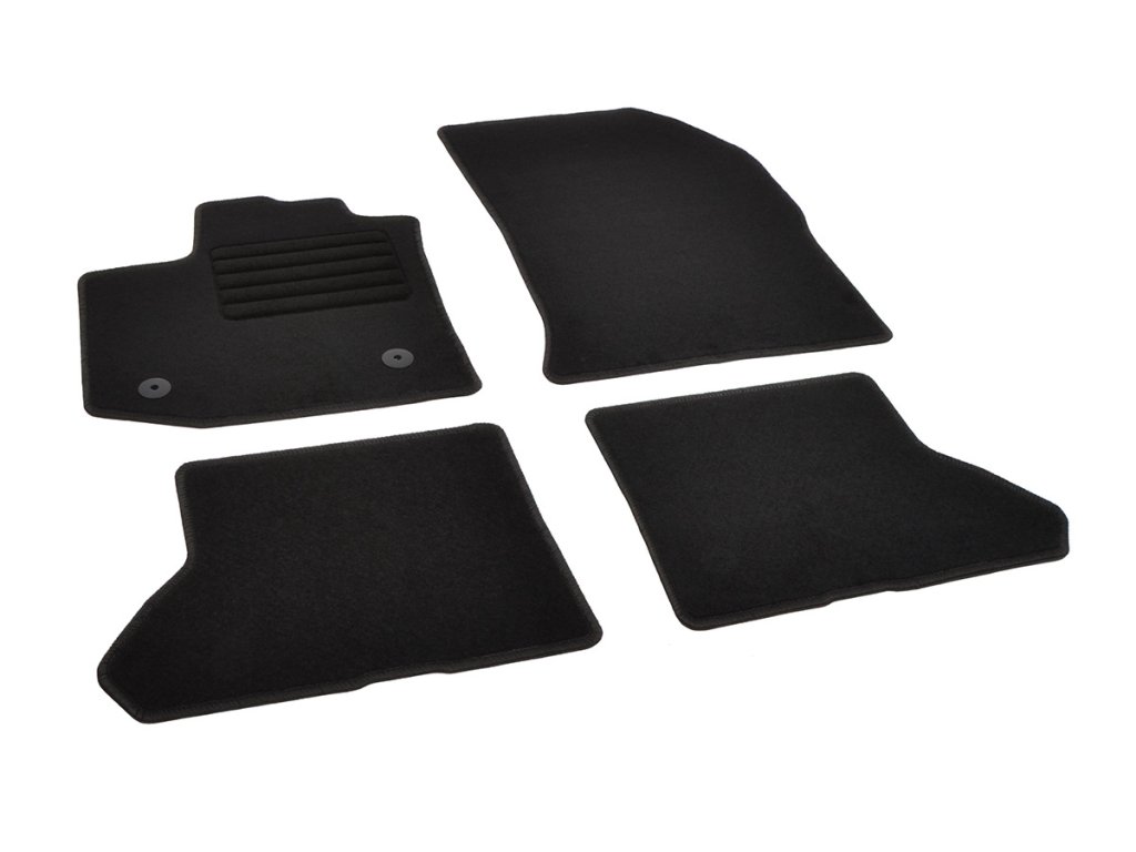 Sada přesných textilních autokoberců Standard, od českého výrobce, v černé barvě s černým přízovým obšitím, zesílením pod pedály a originální fixací.
