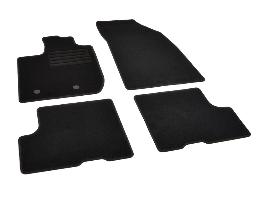 Sada přesných textilních autokoberců Standard, od českého výrobce, v černé barvě s černým přízovým obšitím, zesílením pod pedály a originální fixací.