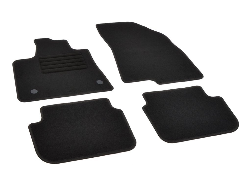 Sada přesných textilních autokoberců Standard, od českého výrobce, v černé barvě s černým přízovým obšitím, zesílením pod pedály a originální fixací.