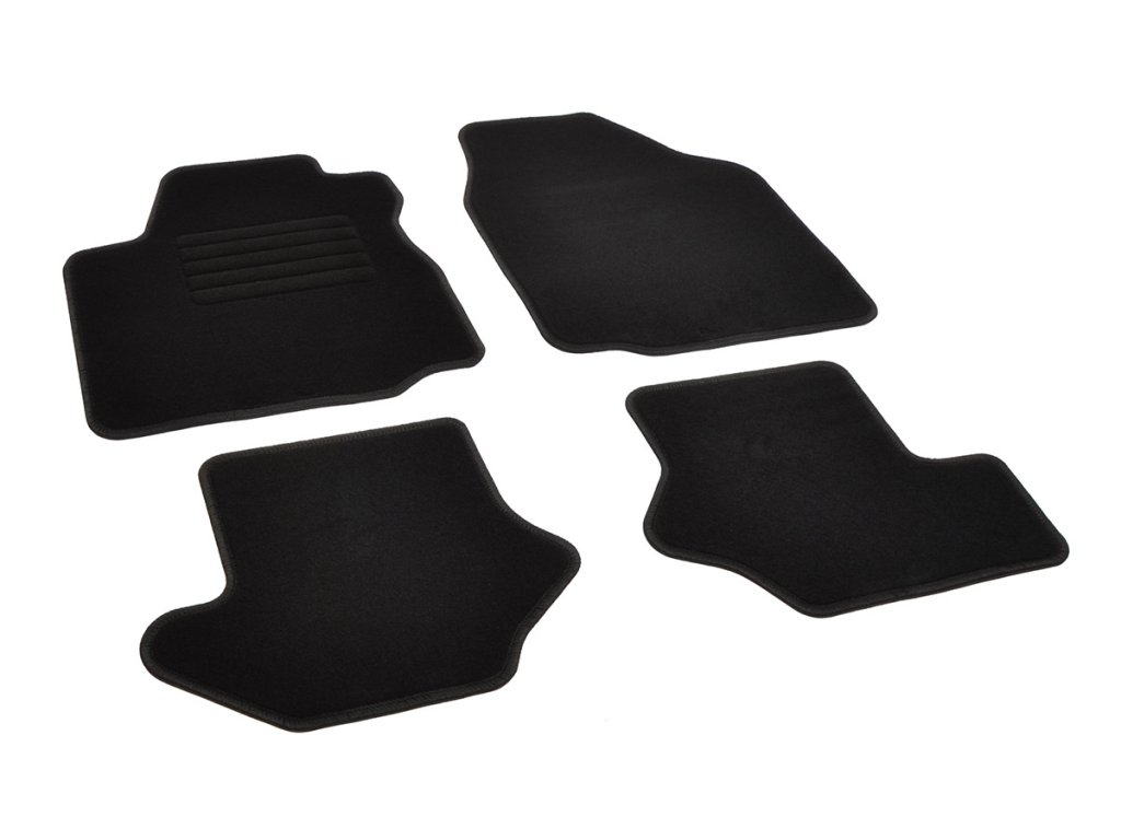 Sada přesných textilních autokoberců Standard, od českého výrobce, v černé barvě s černým přízovým obšitím, zesílením pod pedály a originální fixací.