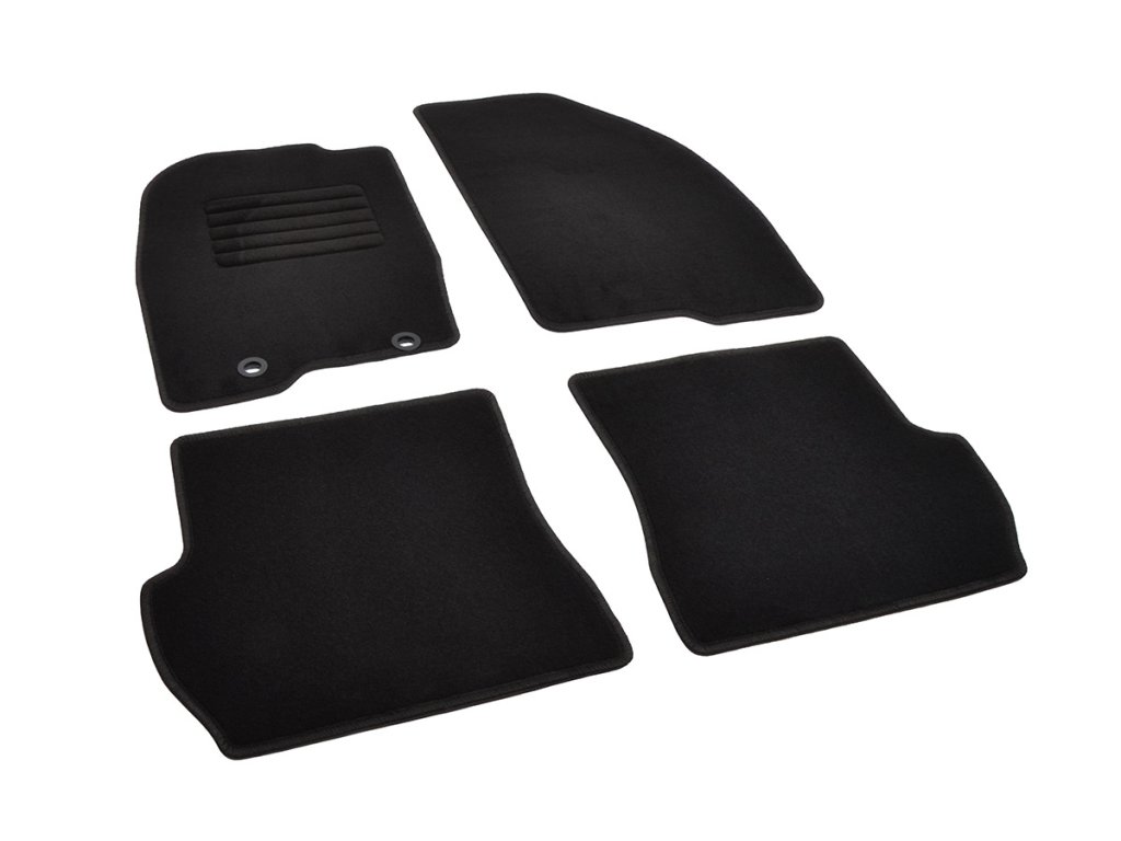 Sada přesných textilních autokoberců Standard, od českého výrobce, v černé barvě s černým přízovým obšitím, zesílením pod pedály a originální fixací.