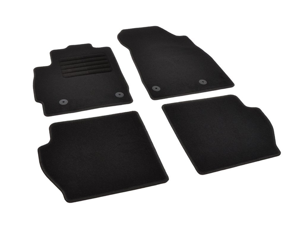 Sada přesných textilních autokoberců Standard, od českého výrobce, v černé barvě s černým přízovým obšitím, zesílením pod pedály a originální fixací.