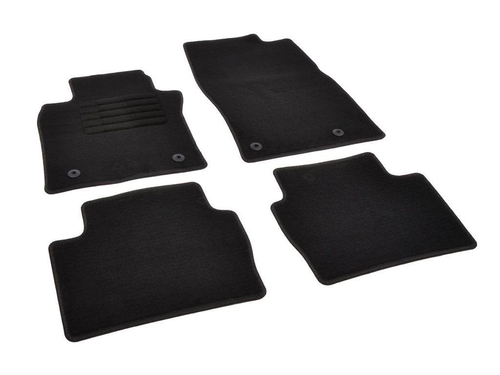 Sada přesných textilních autokoberců Standard, od českého výrobce, v černé barvě s černým přízovým obšitím, zesílením pod pedály a originální fixací.