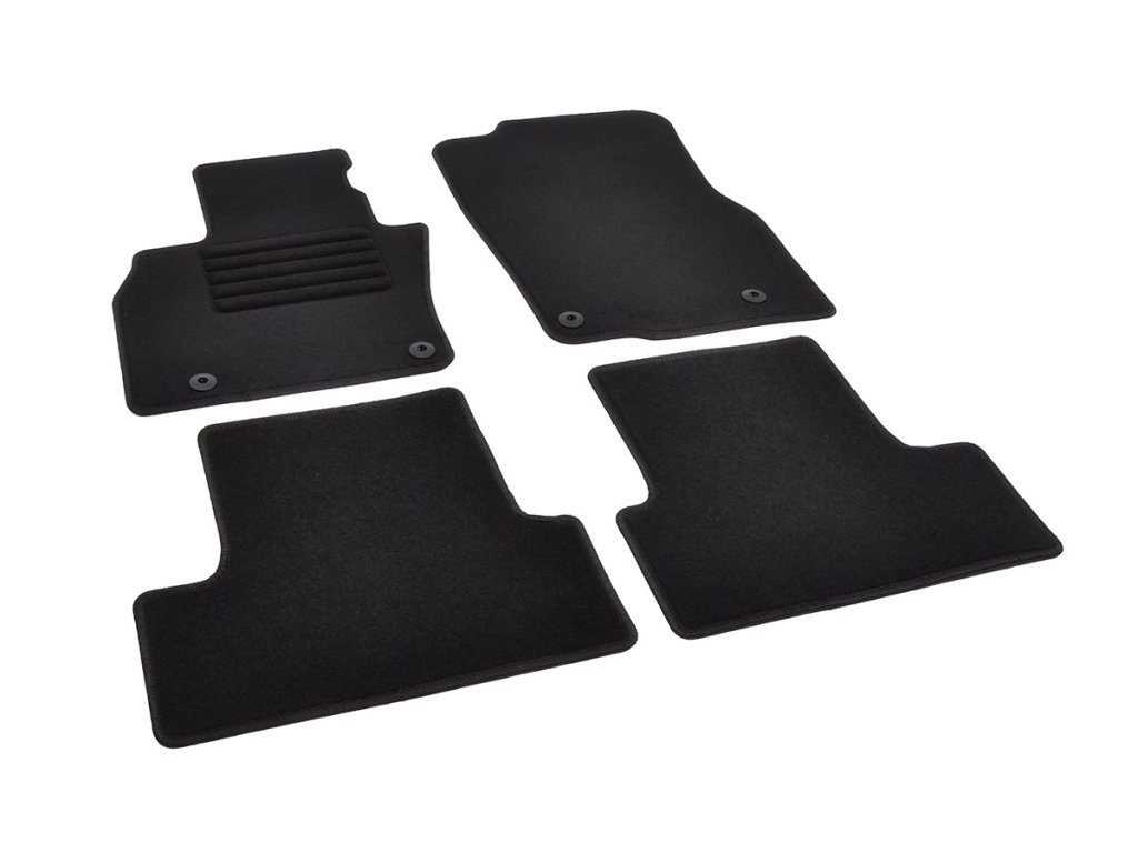 Sada přesných textilních autokoberců Standard, od českého výrobce, v černé barvě s černým přízovým obšitím, zesílením pod pedály a originální fixací.