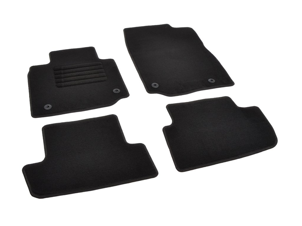 Sada přesných textilních autokoberců Standard, od českého výrobce, v černé barvě s černým přízovým obšitím, zesílením pod pedály a originální fixací.