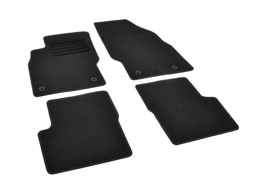 Sada přesných textilních autokoberců Standard, od českého výrobce, v černé barvě s černým přízovým obšitím, zesílením pod pedály a originální fixací.