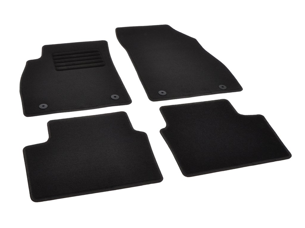 Sada přesných textilních autokoberců Standard, od českého výrobce, v černé barvě s černým přízovým obšitím, zesílením pod pedály a originální fixací.