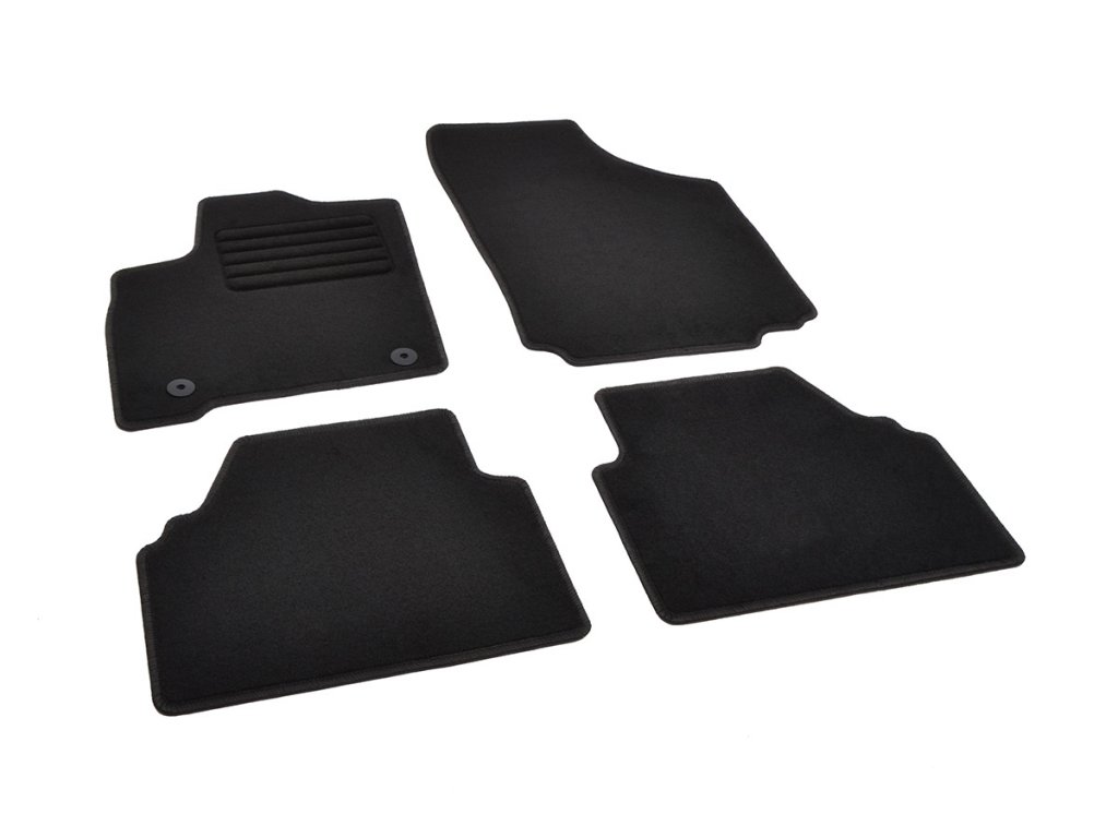 Sada přesných textilních autokoberců Standard, od českého výrobce, v černé barvě s černým přízovým obšitím, zesílením pod pedály a originální fixací.