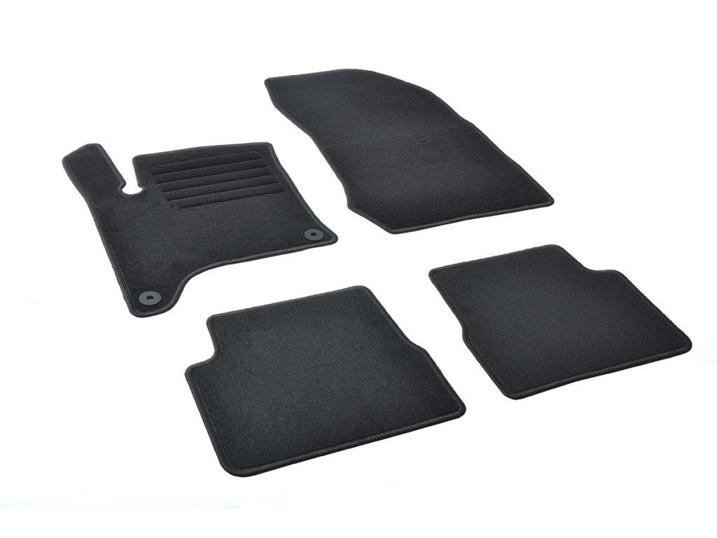 Sada přesných textilních autokoberců Standard, od českého výrobce, v černé barvě s černým přízovým obšitím, zesílením pod pedály a originální fixací.