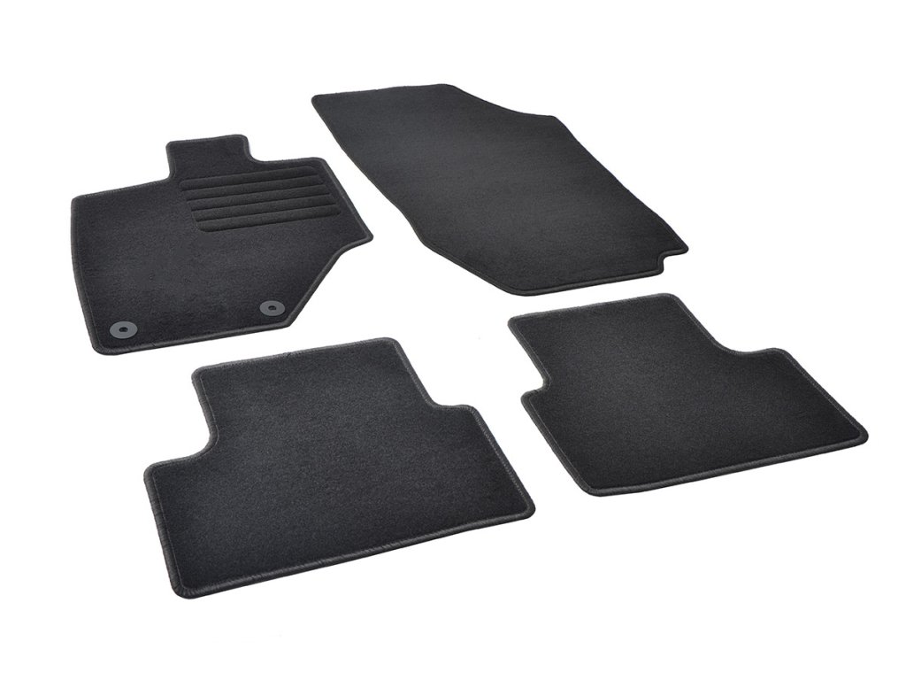 Sada přesných textilních autokoberců Standard, od českého výrobce, v černé barvě s černým přízovým obšitím, zesílením pod pedály a originální fixací.