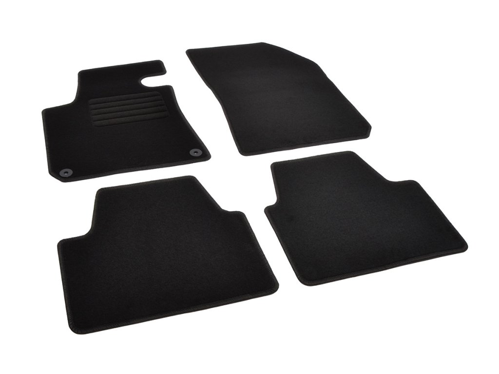 Sada přesných textilních autokoberců Standard, od českého výrobce, v černé barvě s černým přízovým obšitím, zesílením pod pedály a originální fixací.