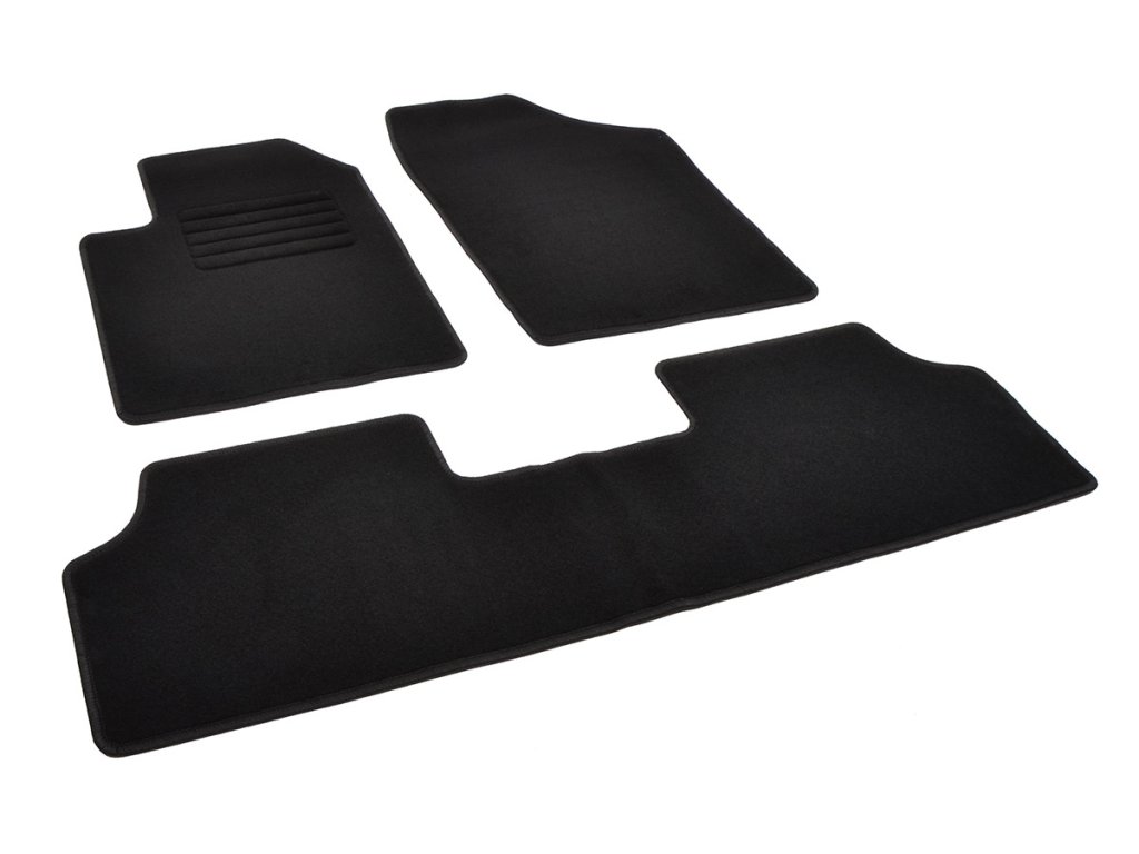 Sada přesných textilních autokoberců Standard, od českého výrobce, v černé barvě s černým přízovým obšitím, zesílením pod pedály a originální fixací.