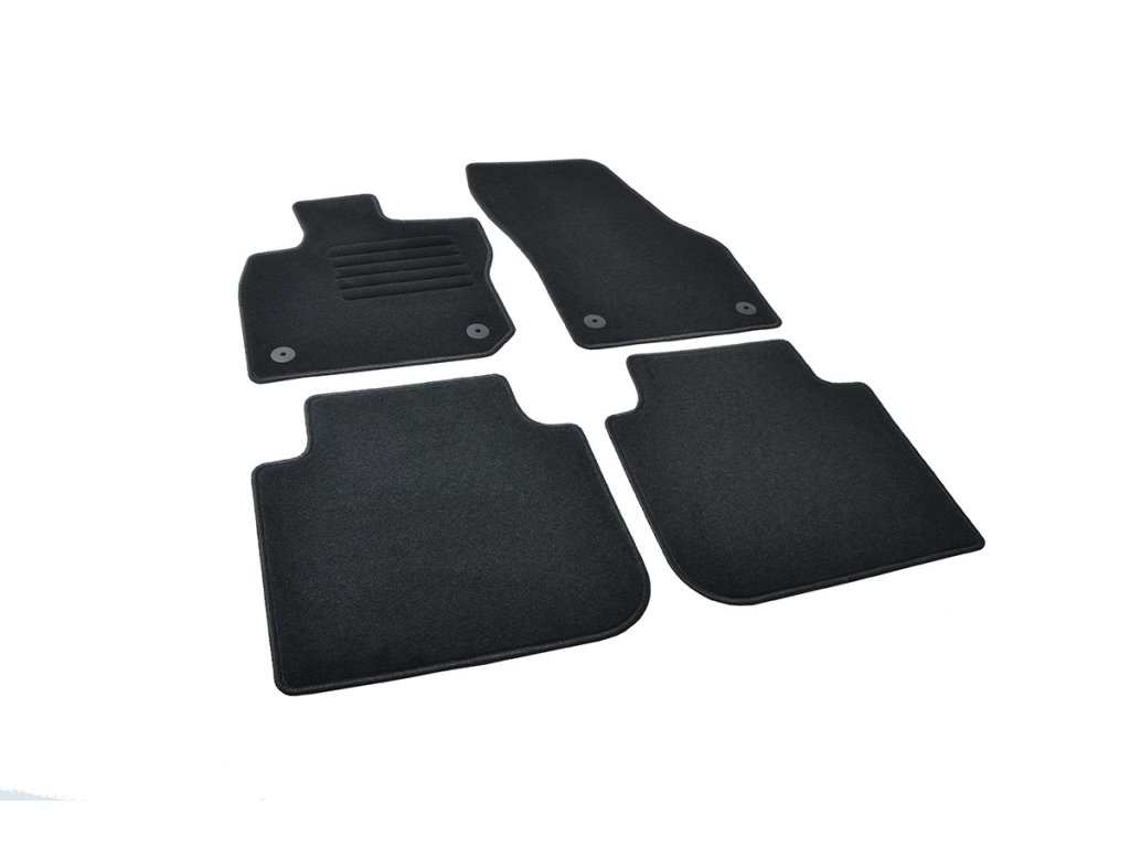 Sada přesných textilních autokoberců Standard, od českého výrobce, v černé barvě s černým přízovým obšitím, zesílením pod pedály a originální fixací.