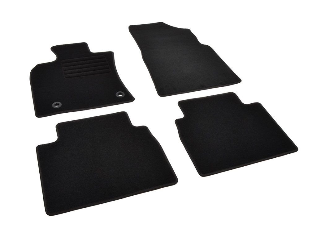 Sada přesných textilních autokoberců Standard, od českého výrobce, v černé barvě s černým přízovým obšitím, zesílením pod pedály a originální fixací.