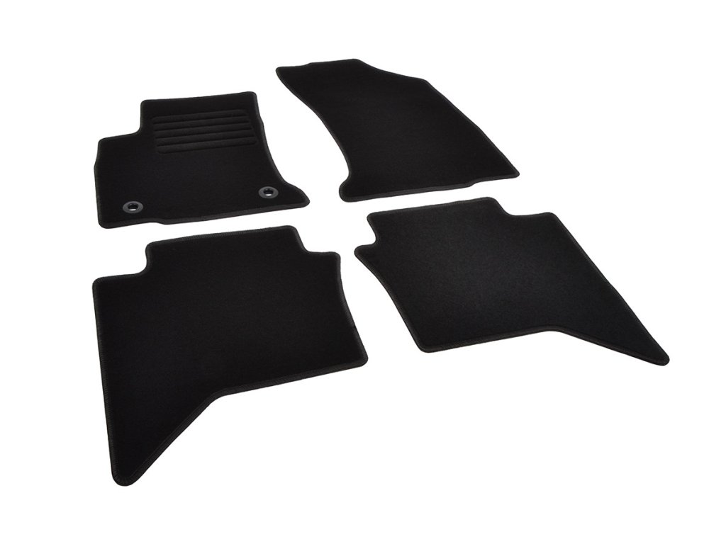 Sada přesných textilních autokoberců Standard, od českého výrobce, v černé barvě s černým přízovým obšitím, zesílením pod pedály a originální fixací.