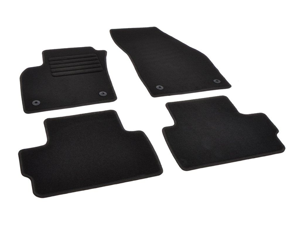 Sada přesných textilních autokoberců Standard, od českého výrobce, v černé barvě s černým přízovým obšitím, zesílením pod pedály a originální fixací.