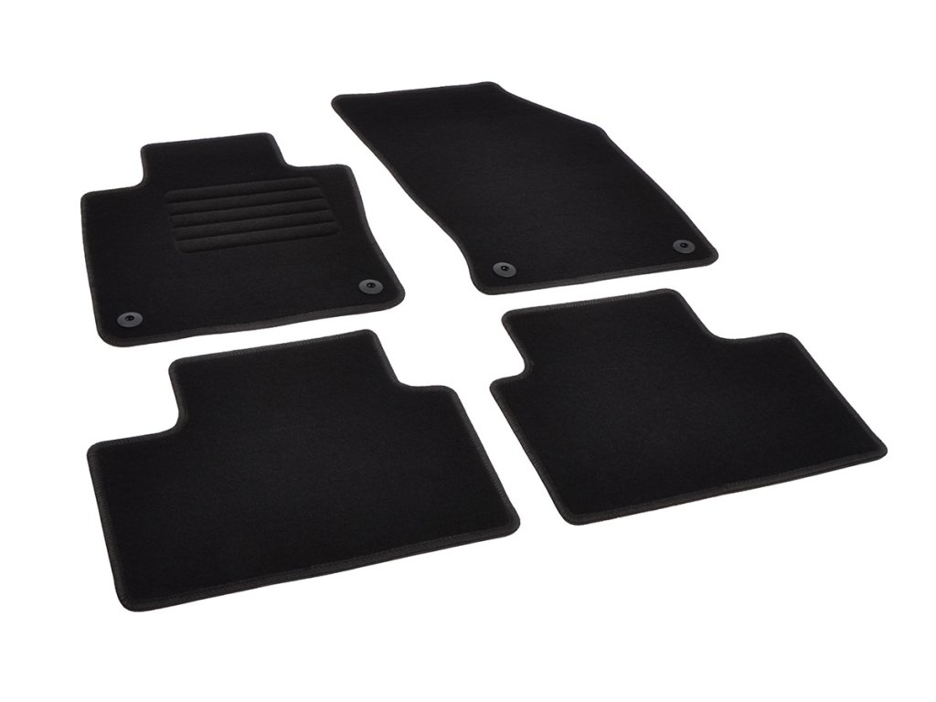Sada přesných textilních autokoberců Standard, od českého výrobce, v černé barvě s černým přízovým obšitím, zesílením pod pedály a originální fixací.