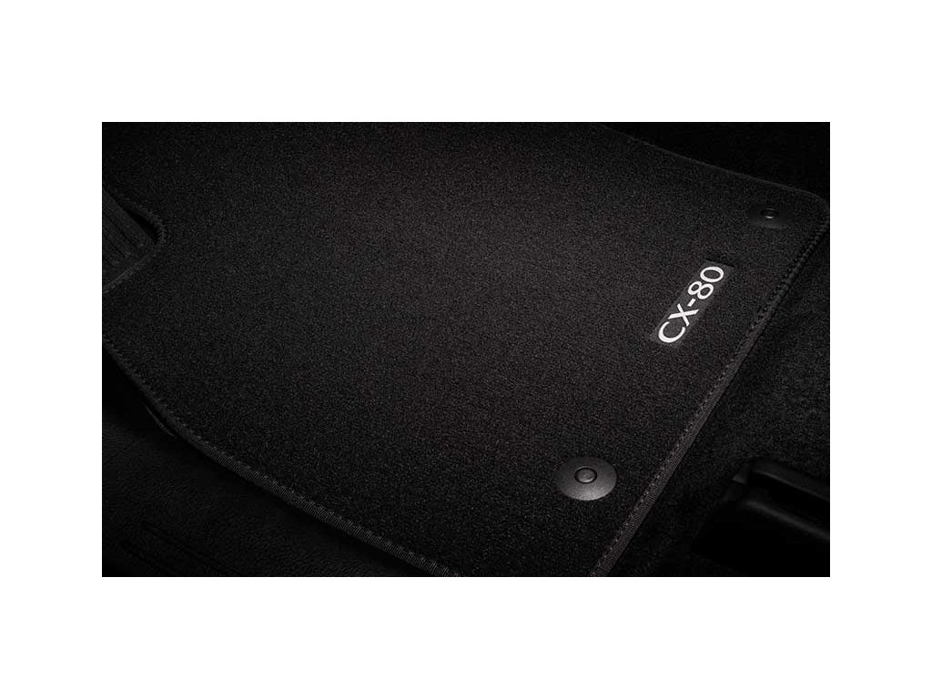 Přední rohože jsou opatřeny logem „CX-80“ a lze je bezpečně upevnit pomocí originálního upevňovacího systému Mazda se čtyřmi upevňovacími kroužky.